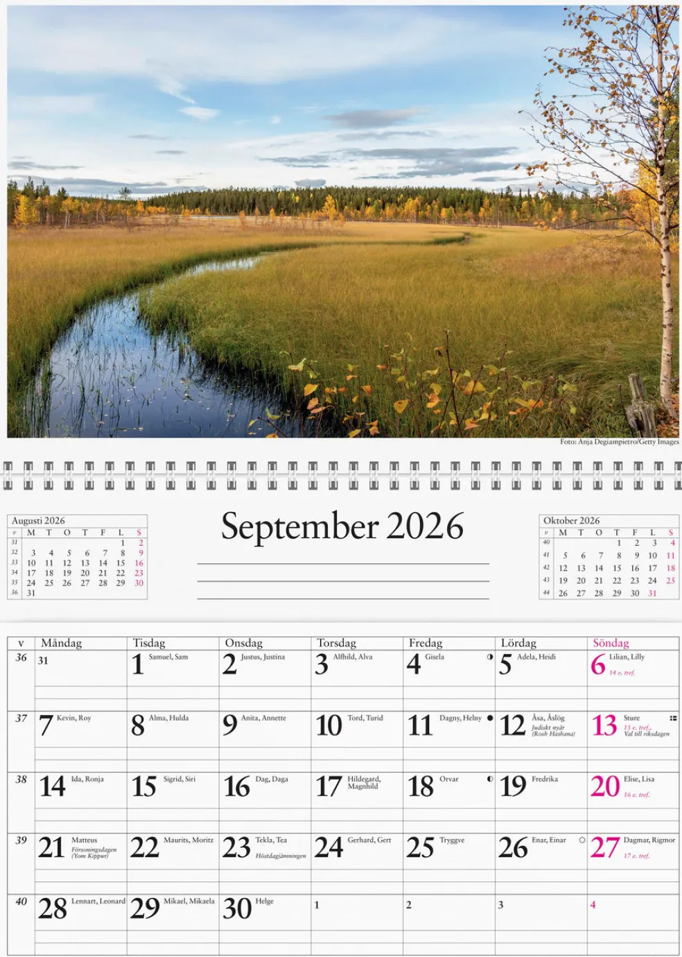 12 kaunista luontokuvaa. Joka kuukaudelle säilytystasku laskuja, kuitteja ja muita tärkeitä tositteita varten. Aukeamalla edellisen sekä tulevan kuukauden kalenteritaulukot. Kalenteri sisältää nimipäivät, liputuspäivät, kansalliset pyhäpäivät ja kuun vaiheet. Ruotsinkielinen. Parikierresidottu. FSC®. Koko: 250×352 mm (avattuna).