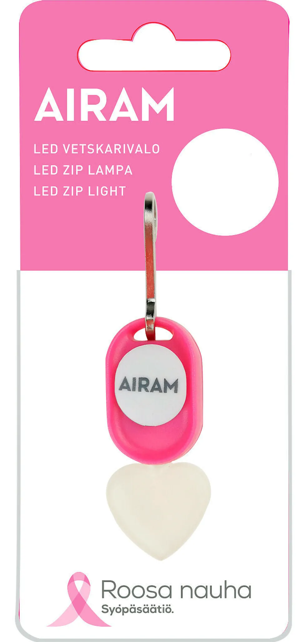 Airamin Roosa nauha -tuotteilla tuet tärkeää asiaa: lahjoitamme jokaisesta ostetusta Roosa nauha -tuotteesta osuuden Syöpäsäätiön syöpätutkimustyöhön. Tuotteen lahjoitusosuus on 0,25€. Tämä supersuosittu, pieni ja kätevä vetoketjuun kiinnitettävä huomiovalo tuo turvaa syyspimeään. Niin sievä, että voit käyttää sitä vetoketjussa muulloinkin koristeena. Sydänkoriste loistaa valkoista valoa, joka lisää näkyvyyttä ja turvallisuutta. Paristot (2 x CR1220) sisältyvät pakkaukseen, joten voit ottaa valon heti käyttöön. Tämä ihastuttava ja käytännöllinen lisävaruste on täydellinen tapa lisätä turvallisuutta ja samalla tukea tärkeää syöpätutkimusta.