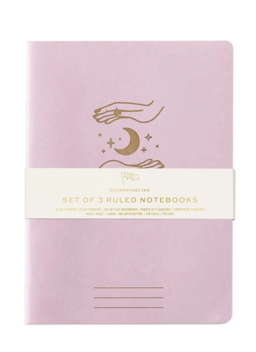 Mystic muistivihkosetti, 3 vihkoa per setti. Koko 15.24cm x 20.32cm. 48-sivuinen muistivihko happovapaalla paperilla. Kannessa foliointi.