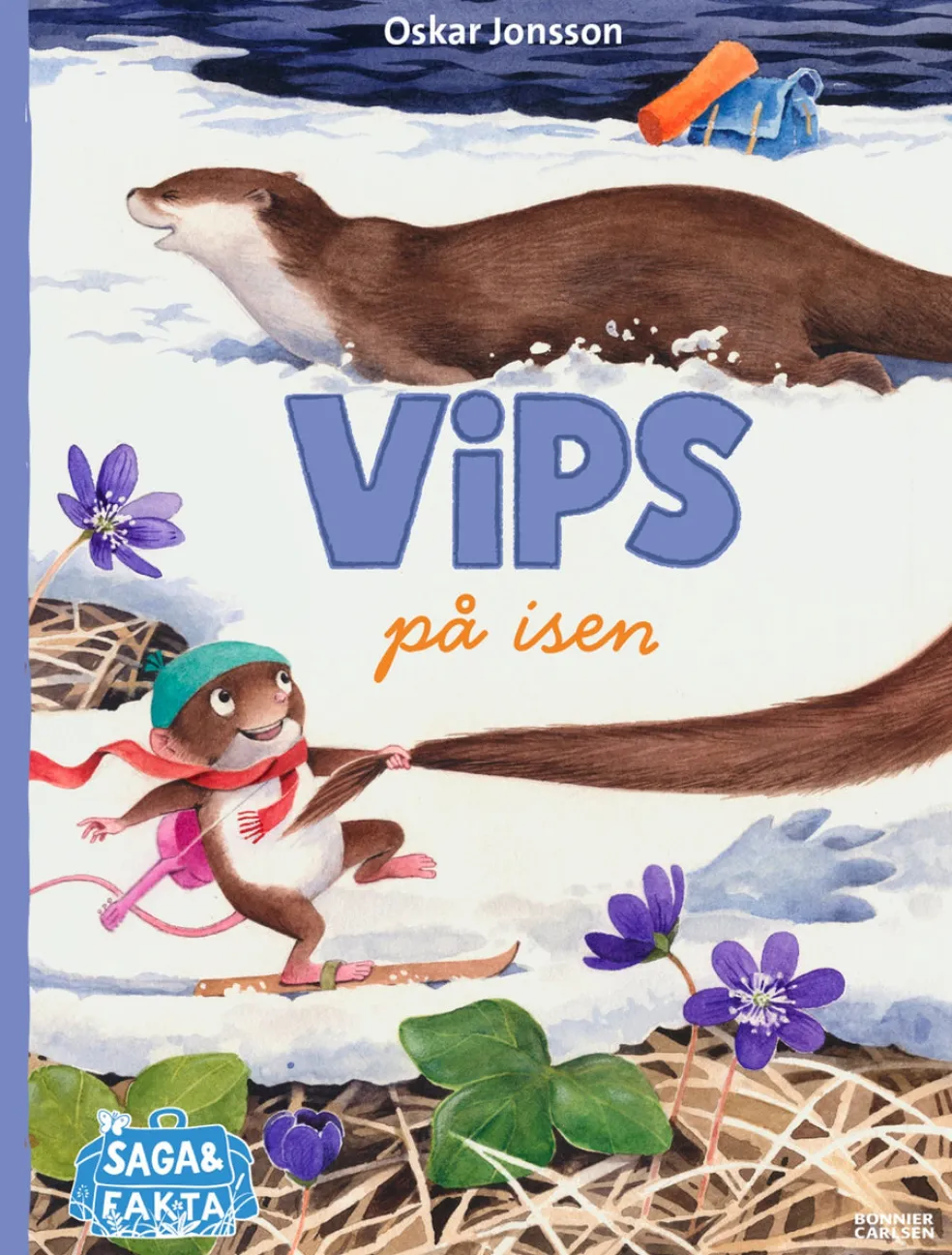 Det är tidig vårvinter i skogen. Den lilla näbbmusen Vips är ute på skidtur och får plötsligt syn på något ute på isen. Vips tar fram sin kikare ur ryggsäcken och ser att det är en fisk som sprattlar. Men hur har den hamnat där? När Vips kommer fram till iskanten är fisken borta men istället tittar ett stort huvud med viftande öron och pigga ögon upp ur vattnet. Det är uttern! Vips får en ny, spännande kompis och får lära sig mer om naturen runtomkring. Oskar Jonsson berättar sina i bilderböcker, med oemotståndliga akvarellbilder, om den charmiga livsnjutaren som nyfiket vill upptäcka världen och som vill hjälpa alla som behöver hjälp. Läs också ”Vips vid bäcken” och ”Vips i trädet” där saga blandas med fakta.