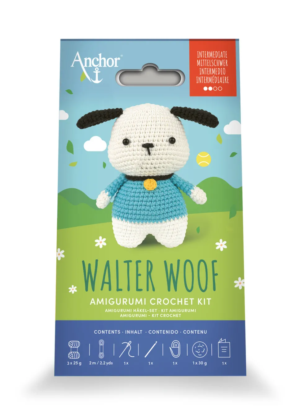 Toteuta virkkaamalla soma Walter-koira. Pakkaus sisältää kaiken tarvittavan amigurumihahmon tekemiseen: 3 kerä lankaa (100 % puuvilla), virkkuukoukun, täytteen, neulan, ohjeet (EN/DE/IT/ES/PT/FR/TR) ja muut tarvikkeet. Vaikeustaso: keskitaso. Valmiin hahmon koko on n. 11 cm. Pakkauksen koko 13cm x 23cm x 6,5 cm.