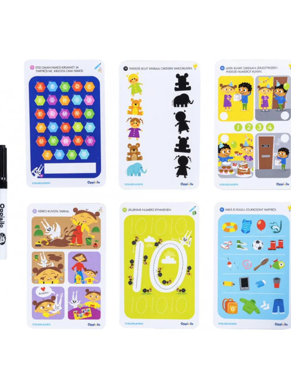 Etsi kuvasta, yhdistä parit, järjestä tarina, ratkaise sokkelo, harjoittele numeroita ja pähkäile tunnetaitoja. Runsas pakkaus monipuolisia tehtäviä, jotka tarjoavat lapselle onnistumisen elämyksiä. Paketti sisältää 50 kaksipuolista korttia ja poispyyhittävän tussin, jolla tehtävät voi tehdä yhä uudelleen ja uudelleen!