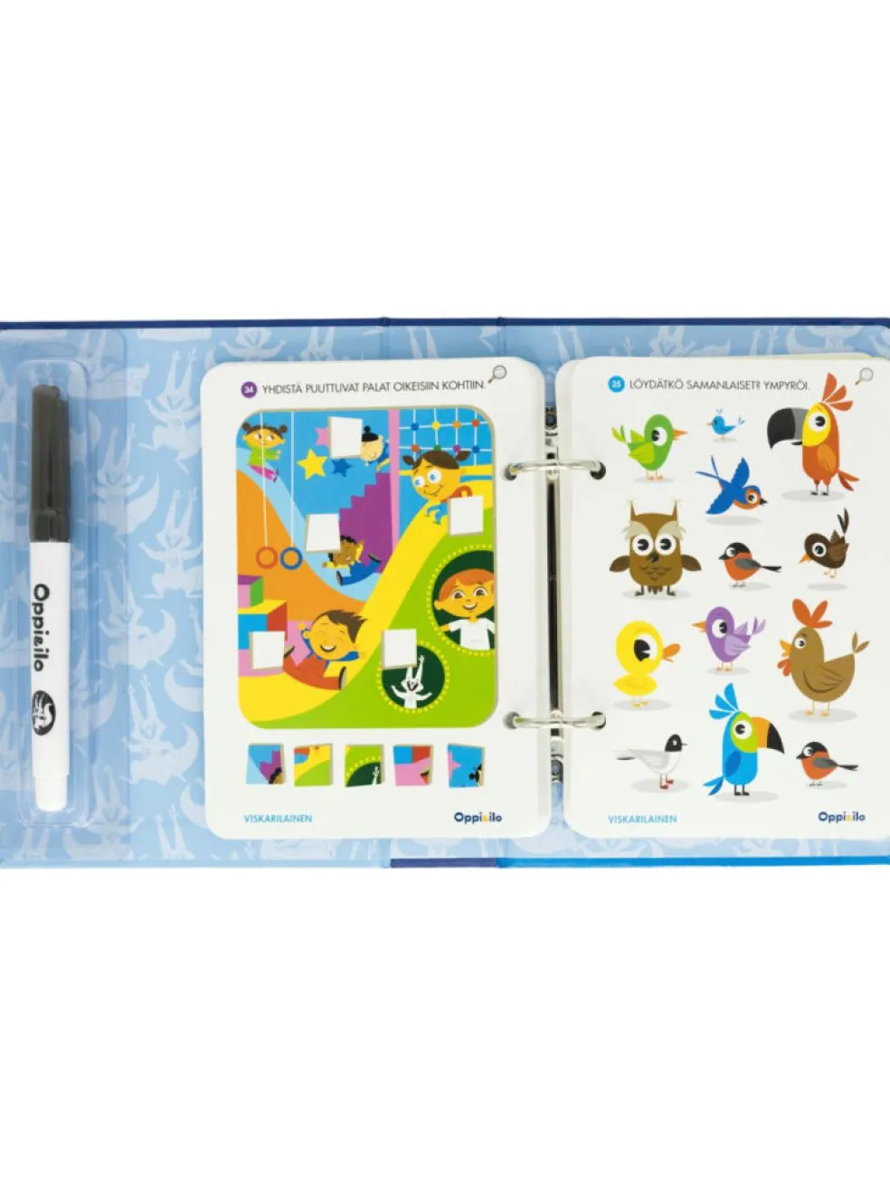 Etsi kuvasta, yhdistä parit, järjestä tarinat, ratkaise sokkelo, harjoittele numeroita ja pähkäile tunnetaitoja. Runsas pakkaus monipuolisia tehtäviä, jotka tarjoavat lapselle onnistumisen elämyksiä. Kirja sisältää 50 kaksipuolista korttia ja poispyyhittävän tussin, jolla tehtävät voi tehdä uudelleen ja uudelleen!