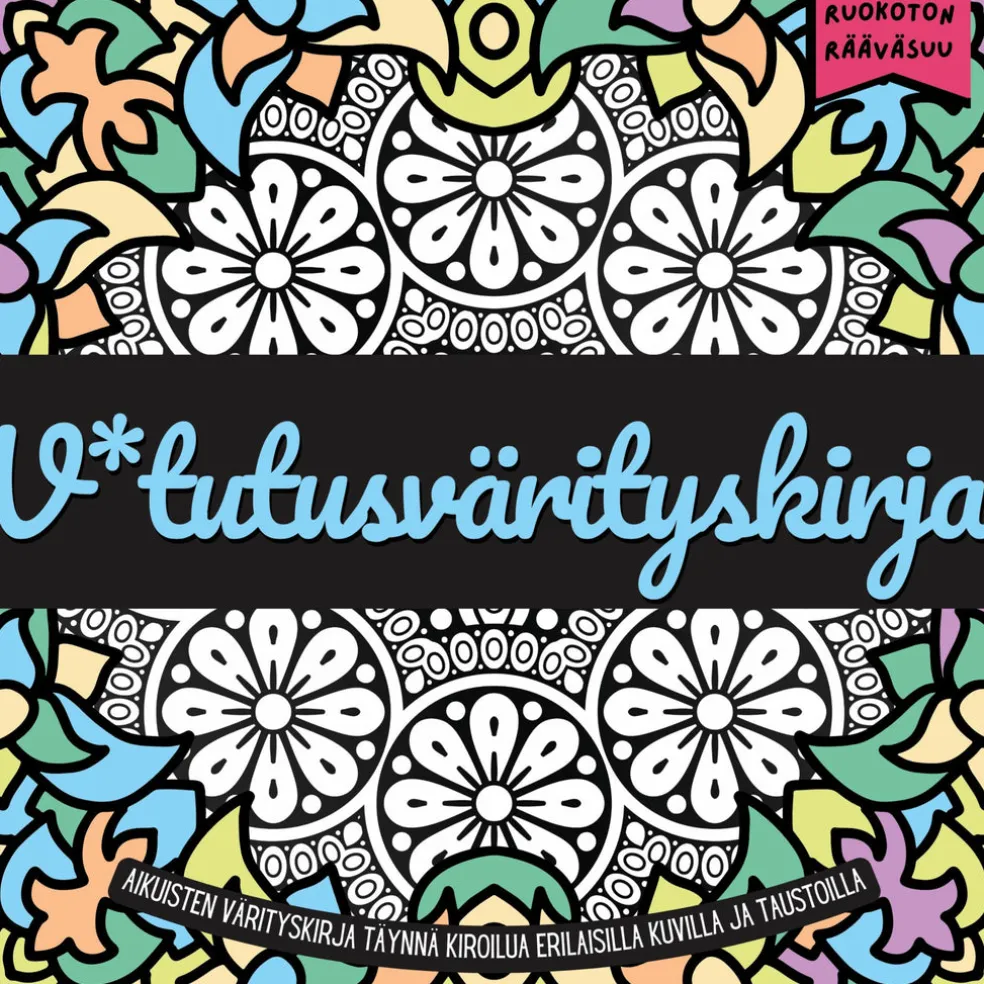 Tämä aikuisten värityskirja pitää sisällään geometrisia kuvioita, mandala-kuvioita ja ärsyttäviä koukeroita. Mutta mitä olisi v*tutusvärityskirja ilman kirosanoja? Jokainen mandala ja jokainen muukin sivu on höystetty kirosanoilla. Kirosanavärityskirja oli liian pitkä kanteen ja muutenkin kirjan nimi soljuu mukavasti suusta ulos. Niinkuin ne kirosanatkin.