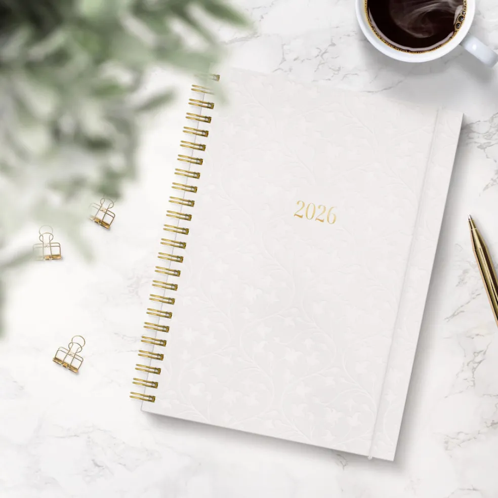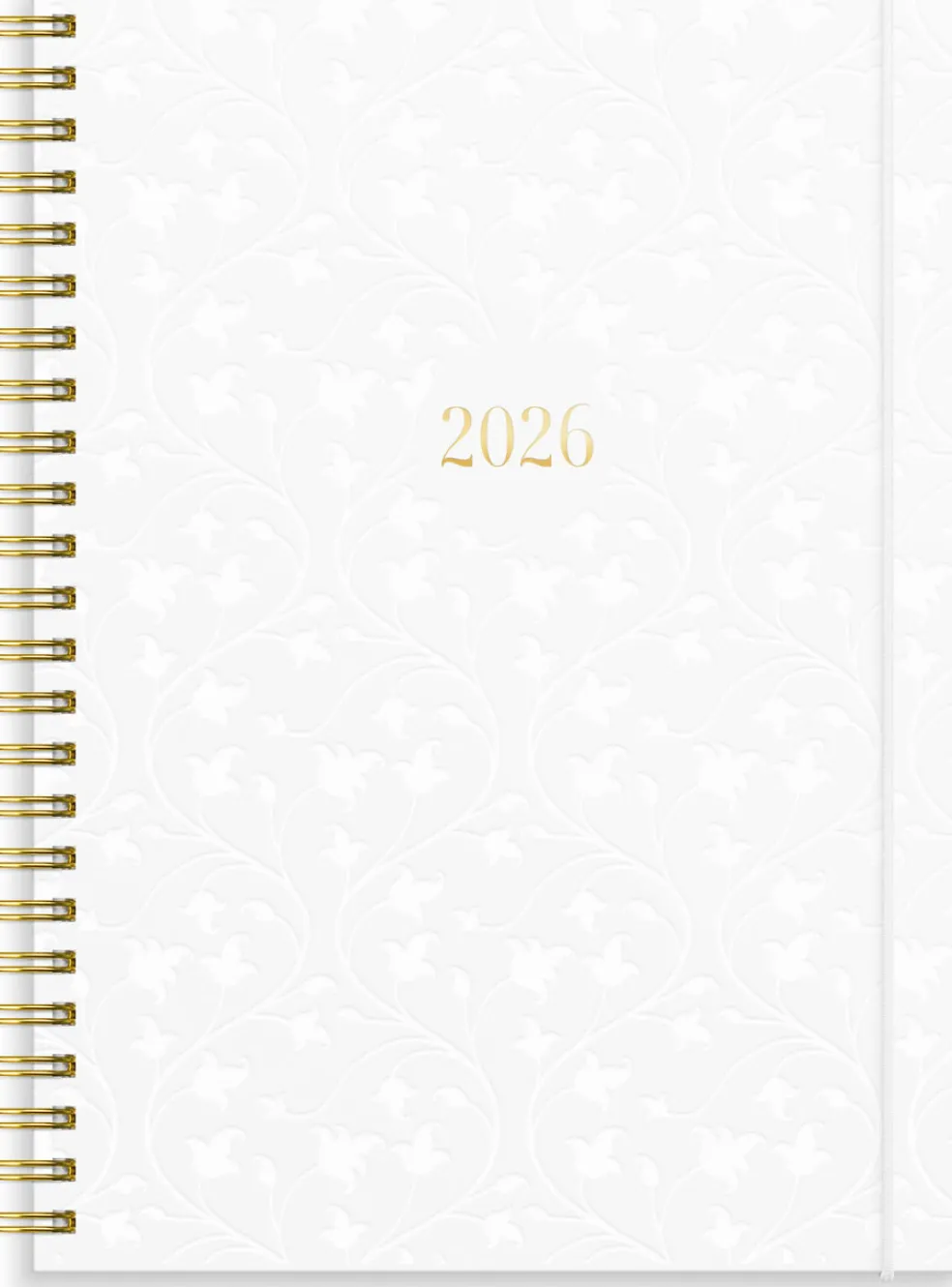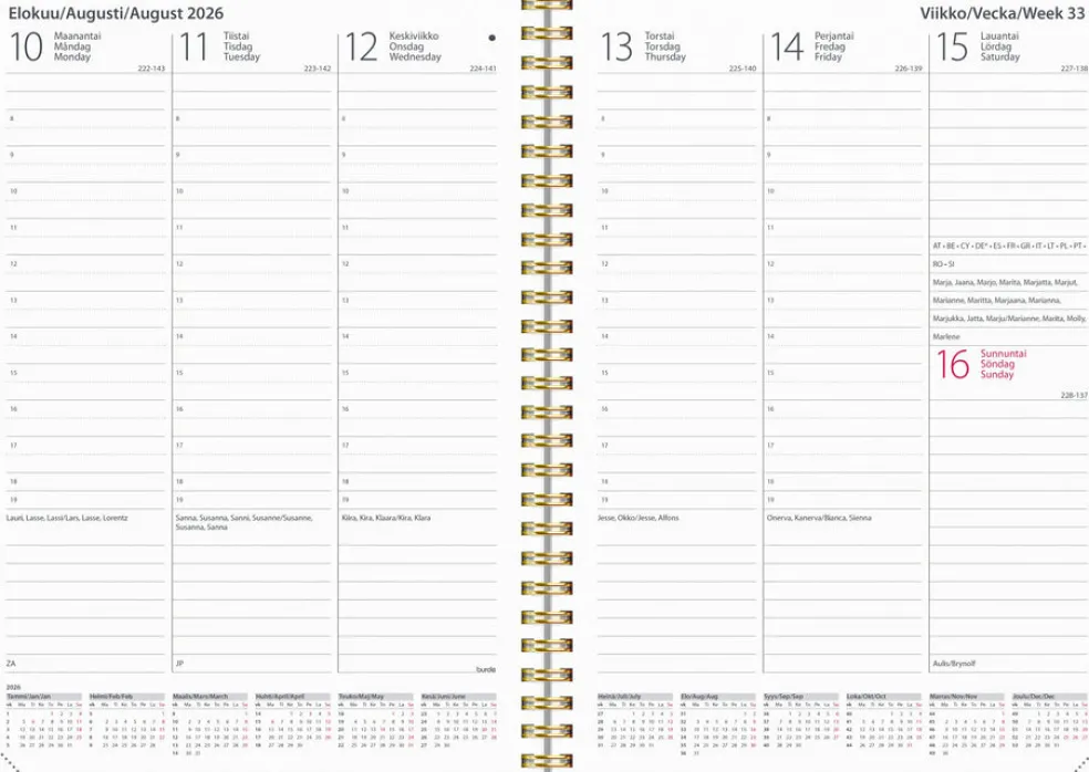 Kartonkikansi kultapainatuksella, kuminauhalla. Kalenterin aukeamalla yksi viikko, tuntijaotus 08-19, muistiinpanotilaa ja koko vuoden kuukausitaulukot. Kalenteri sisältää nimipäivät, juhlapyhät, liputuspäivät, kuun vaiheet, vuosisuunnitelmat kuluvalle ja seuraavalle vuodelle, kalendaariset tiedot, yleiset pyhäpäivät maailmalla, auringon nousu- ja laskuajat sekä muistiinpanosivut. Kalenteriosa: vk 51 2025-vk 53 2026/2027. Kolmikielinen: suomi/ruotsi/englanti. Parikierresidottu. FSC®. Koko: 148×210 mm (A5).