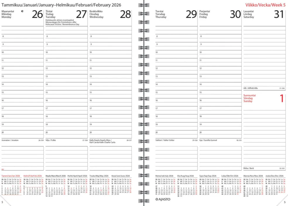 Koko 148 x 210 mm (A5); parikierresidottu; leatherette-kannet; kielisyys: suomi, ruotsi, englanti; 2026 yleiskalendaario; päiväkirja 52/2025–53/2026; vuosisuunnitelmat 2026 ja 2027; kansalliset vapaapäivät; suomalaiset ja suomenruotsalaiset nimipäivät; auringon nousu- ja laskuajat (Helsinki, Oulu); kansainvälinen aika; runsaasti muistiinpanotilaa; kynänpidike; painettu Suomessa; FSC®-sertifioitu tuote.