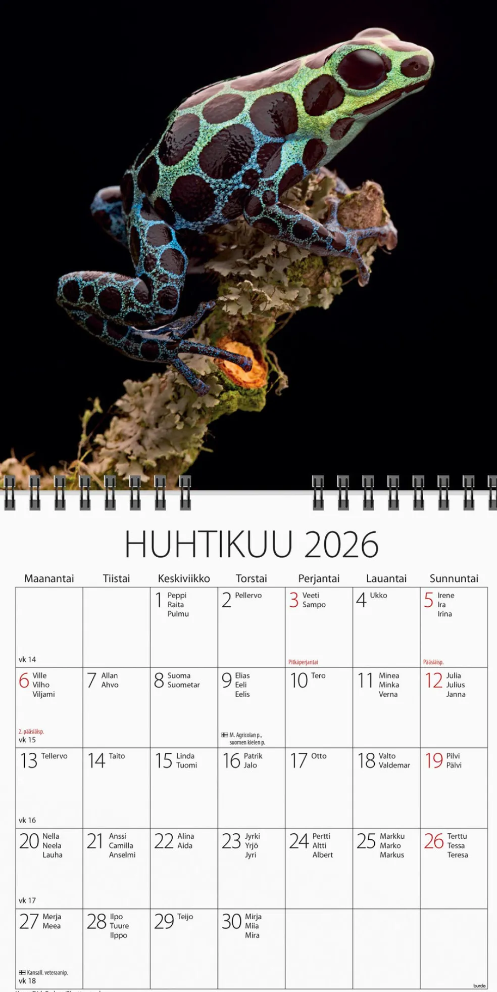 12 kuvaa eläimistä.. Kalenteri sisältää nimipäivät, liputuspäivät ja kansalliset pyhäpäivät. Suomenkielinen. Parikierresidottu. FSC®. Koko: 160×320 mm (avattuna).