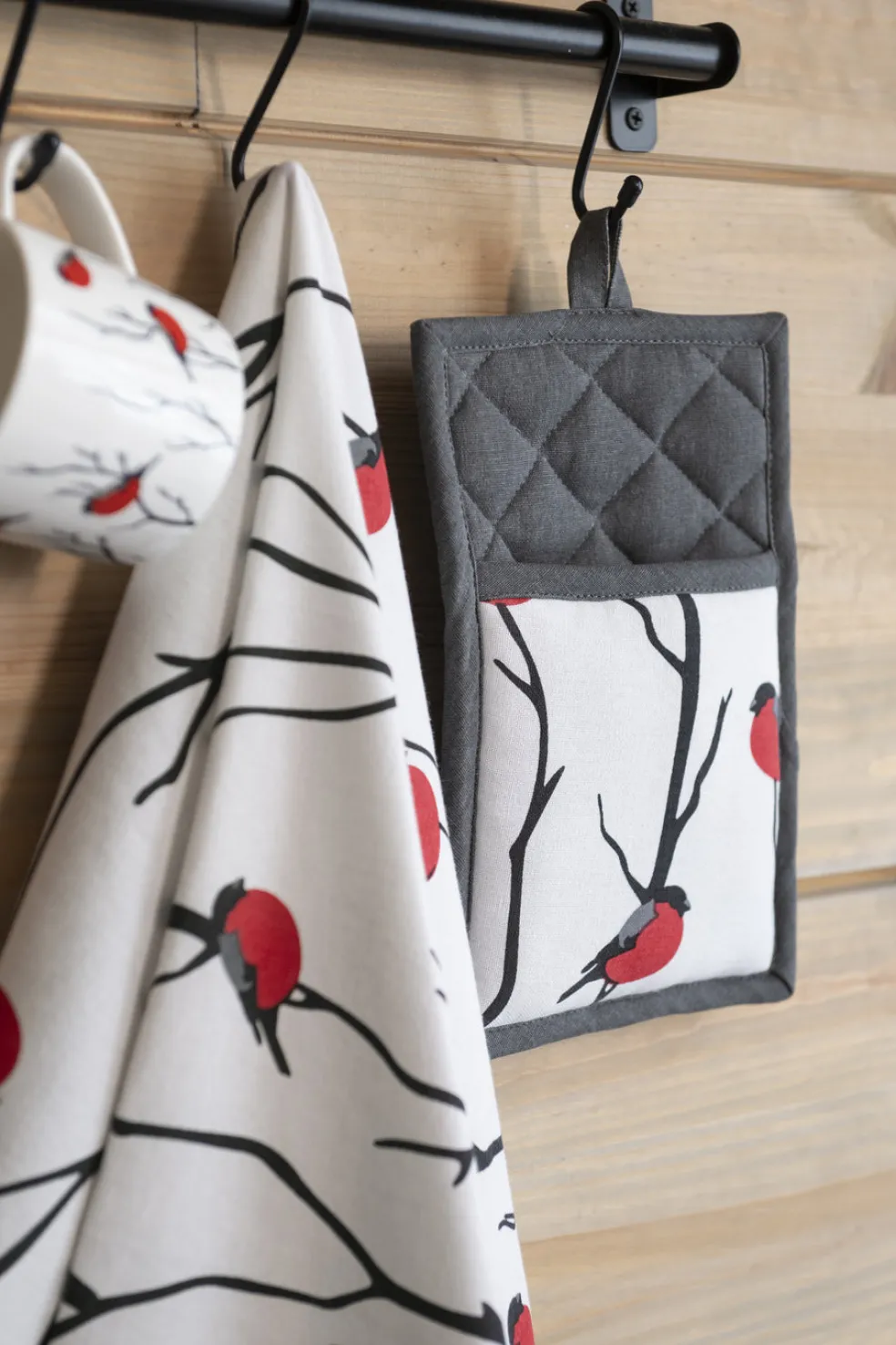Jouluinen taskullinen patalappu punatulkkukuosilla. Ei haittaa, vaikka tämä patalappu jäisi joulupöytään! Koko 16 x 24 cm. Materiaali 100 % puuvilla, täyte polyesterivanu. Pesu 30 asteessa.